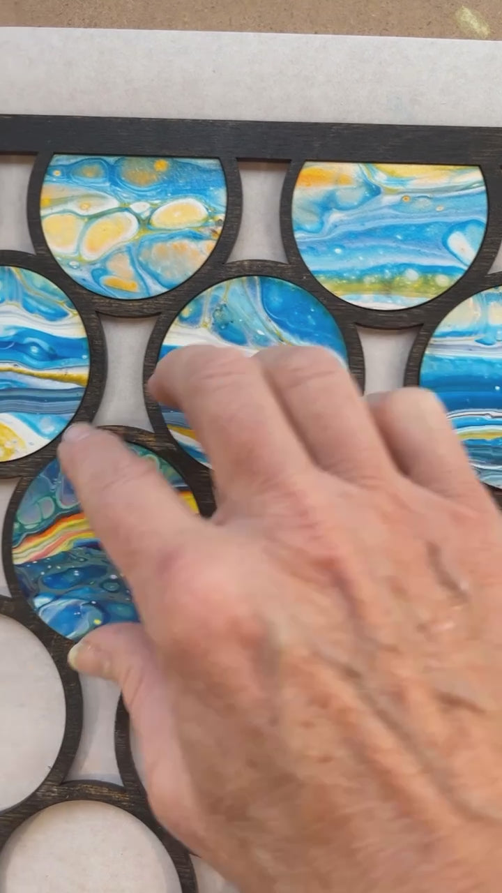 This stunning piece of wood mosaic artwork showcases a captivating circular design, featuring striking shades of blue and green. The flowing lines in the design suggest the fluidity of water with accents of yellow and orange highlights creating a mesmerizing effect. This unique wall sculpture is made from three separate paintings, each contributing exceptional color and pattern to create this beautiful artwork. The hard resin finish adds depth and shine to the piece.