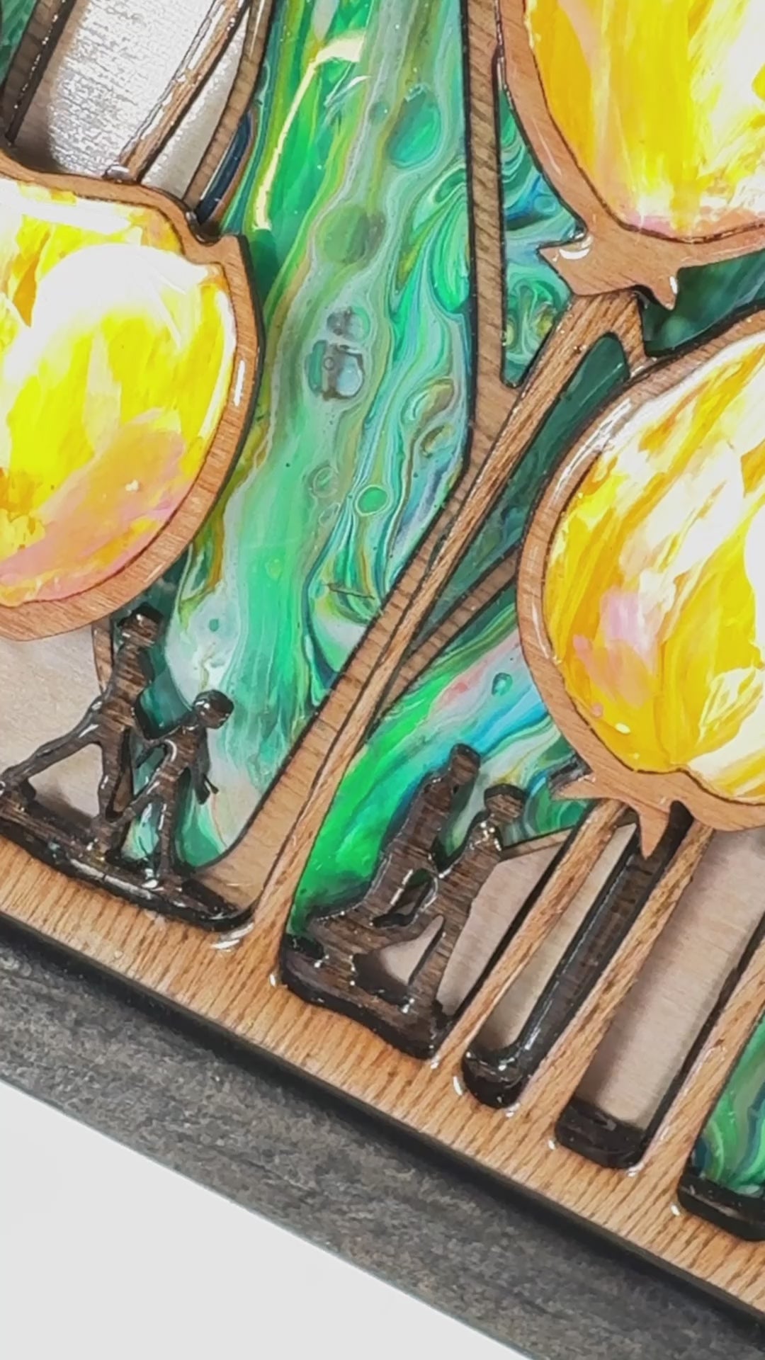 Brighten up your space with this stunning delicate wood inlay art piece that depicts a scene of people walking among a field of yellow flowers. This gorgeous wall art is a gorgeous mosaic made from birch wood and acrylic paint. Each panel is created from 3 stacked paintings to create playful shadows and show off the intricate craftsmanship and detail of the woodwork. The flowers are painted in vivid yellow and orange hues, creating a cheerful and lively atmosphere. The two delicate mosaic panels are mounted on birchwood and are each 12x12x1 inches with a frame. They are also signed and dated on the back by the artist. This is a one-of-a-kind 3D wood inlay wall art that will add charm and beauty to any room.